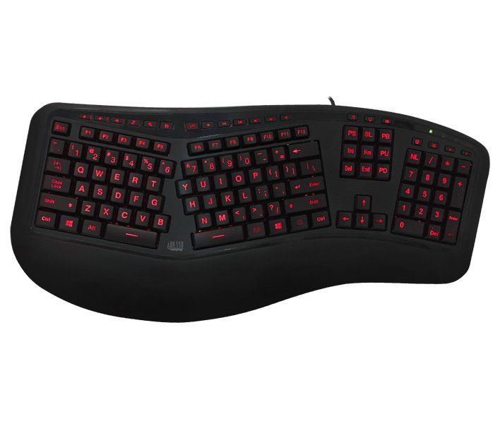 Adesso Tru-Form 150Ergonomická herní klávesnice zajišťuje optimální polohu vašich rukou a přispívá ke snížení tlaku na oblast zápěstí. Nabízí tři barvy podsvícení a multimediální klávesy. K připojení klávesnice slouží 1,8 m dlouhý kabel zakončený USB konektorem.