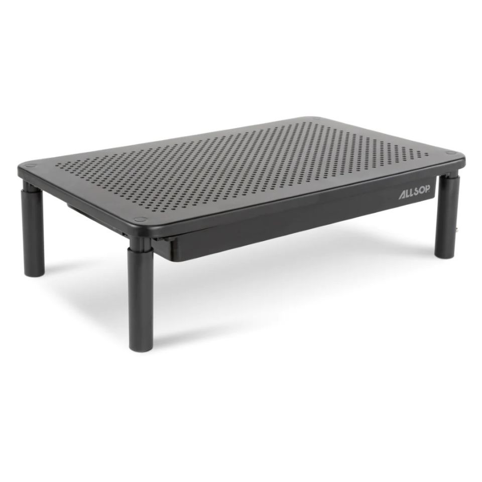 Kovový Art Tri-Level výškově nastavitelný stojan na monitor se zásuvkouTrojúrovňový stojan na monitor Allsop Metal Art má odolnou kovovou platformu s práškovým nástřikem s perforovanými otvory s mikrotečkami a podporuje monitory až do hmotnosti 35 lb a 27 palců. Teleskopické nohy umožňují uživatelům vybrat si ze tří úrovní výšky (4,13 palce, 5,0 palce nebo 5,75 palce) pro ideální ergonomický komfort. Integrovaná úložná zásuvka je ideálním místem pro další zásoby a má slot pro telefon pro snadný přístup.