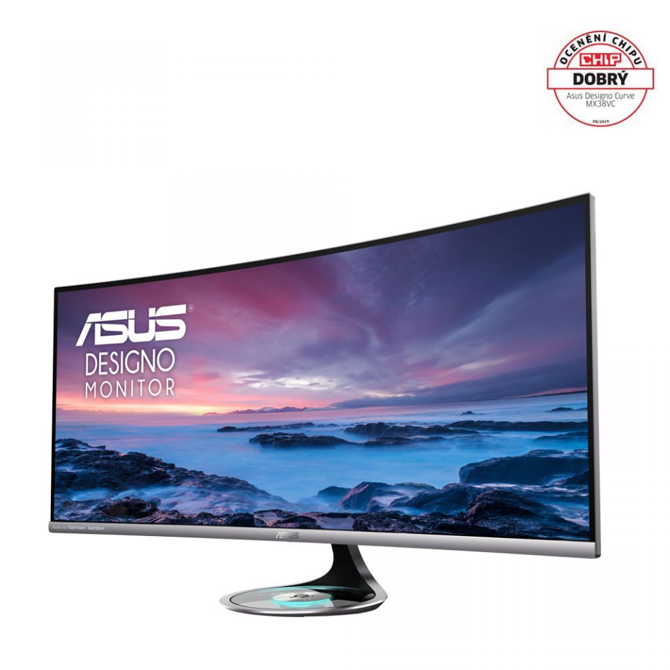 Ultra širokoúhlý zakřivený monitor ASUS Designo Curve MX38VC - 37,5 palce, UWQHD, zakřivení 2300R, bezrámečkový design, bezdrátová nabíječka Qi, audio Harman Kardon, Bluetooth® Music Streaming, Flicker Free, filtr modrého světla-37,5-palcový zakřivený displej UWQHD s širokým pozorovacím úhlem 178° v bezrámečkovém provedení pro briliantní obraz po celé ploše