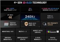 Herní monitor ROG Strix OLED XG27UQDMS – 27 palců (26,5 palců viditelná plocha) 4K (3840 x 2160) Tandemový panel QD-OLED, 240 Hz, 0,03 ms (GTG), kompatibilní s G-SYNC, vlastní chladič, senzor Neo Proximity, rovnoměrný jas, 99 % DCI-P3, OLED Care Pro, ASUS DisplayWidget Center