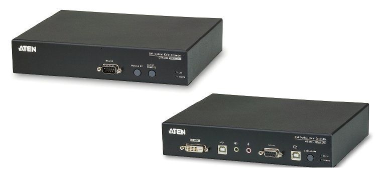 ATEN Extender PC over IP - konzole USB + sériový port RS232CE680 Aten DVI konzole Extender po optickém vlákně umožňuje prodloužení klávesnice a myší USB, monitoru DVI, RS232 portu a portu USB pro ovládání touchpadu, audia na vzdálenost až 600m.