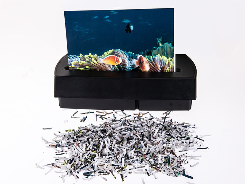 Řezací mechanismus zpracuje náhodně vložené sešívací sponky a kreditní karty