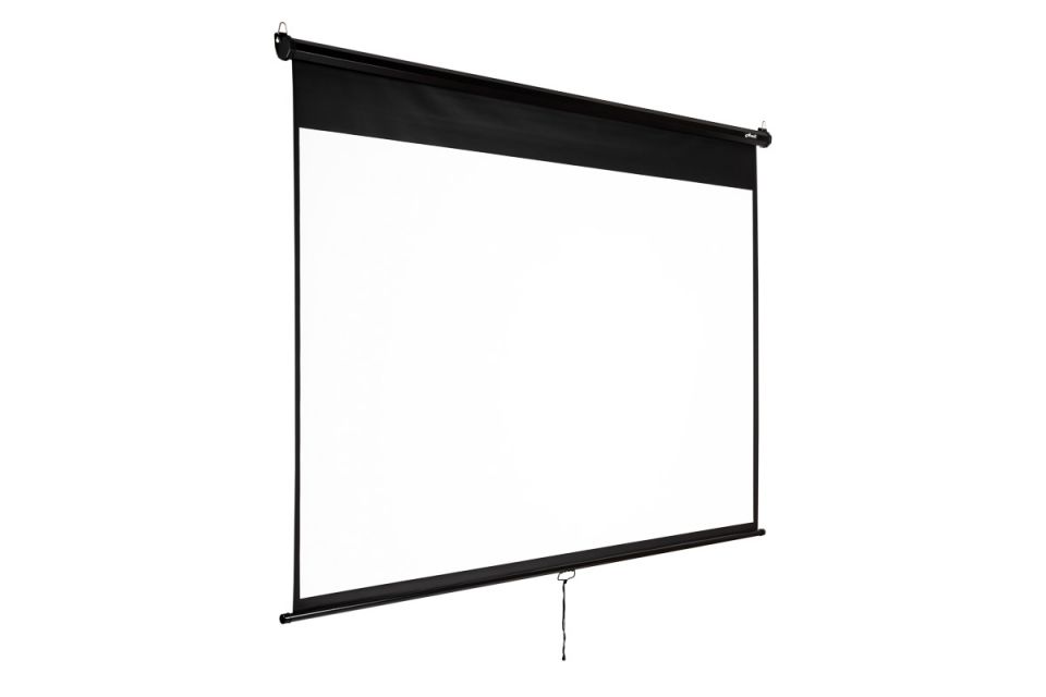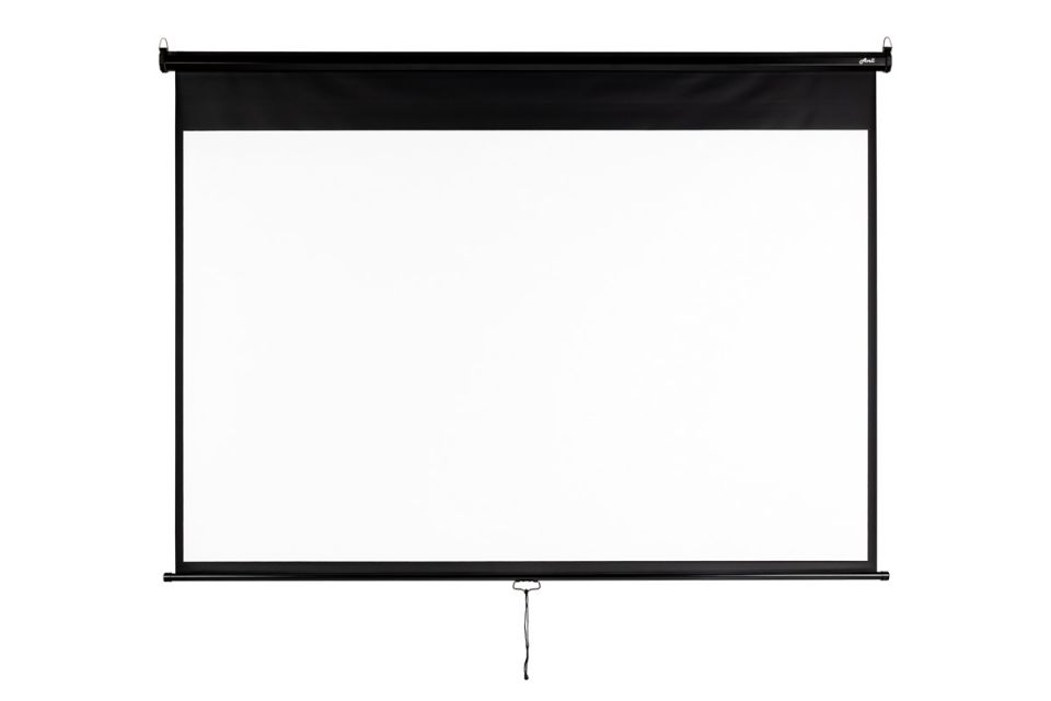 Projekční plátno roletové, rozměr 200 cm × 125 cm, úhlopříčka 92", poměr stran 16:10, matně bílé plátno, černé okraje, černé tělo, k umístění na strop a na zeď, ruční svinováníDotaz na produkt
