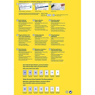 Bílé etikety s vysokou lepivostí od Avery Zweckform drží dvakrát silněji než běžné papírové etikety. Vzhledem k mimořádně silné přilnavosti jsou etikety vhodné pro značení produktů a zásob nebo k vytvoření bezpečnostních oznámení ve vnitřních prostorách. Papírové etikety drží na teplém i studeném podkladu nebo např. na nerovných, hrubých či prašných površích. Samozřejmě se můžete spolehnout na garanci plynulého tisku etiket a na to, že průchod archů etiket tiskárnou neznečistí tiskárnu lepidlem. Etikety s vysokou lepivostí mohou být potisknuty na všech běžných typech tiskáren. Pár jednoduchých kroků pro dokonale vypadající etikety: Další servis, který Vám bezplatně nabízíme - aplikace pro tvorbu profesionálně vypadajících etiket Online Designer Avery® Design & Print. Zde naleznete jak prázdné šablony, do kterých vložíte vlastní text či obrázek, tak i široký výběr již navržených, moderních designů etiket, které pravidelně aktualizujeme a vylepšujeme. Jednoduše zadejte kód etikety, zpracujte, vytiskněte a máte hotovo!