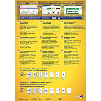 Etikety do těch nejnáročnějších podmínek - ultra odolné etikety od Avery Zweckform. Jejich vlastnosti oceníte jak v interiéru, tak ve venkovním prostředí. Silná přilnavost etiket k různým povrchům, odolnost vůči mořské vodě, mastnotě, špíně, UV záření a teplotám mezi -40°C a + 150°C. Díky těmto vlastnostem se skvěle hodí zejména pro značení ve výrobě, skladech, ke značení kontejnerů apod. Navíc jsou tyto omyvatelné etikety odolné vůči mnohým rozpouštědlům a čisticím prostředkům. Ultra odolné etikety Vás přesvědčí také prvotřídními tiskovými výsledky a prokázanou Top kvalitou. Ostrý tisk, který se nerozmazává a vysoká lepivost na nejrůznějších typech povrchů. Tyto vlastnosti našich etiket pravidelně testujeme ve vlastních laboratořích. Samozřejmě se můžete spolehnout na garanci plynulého tisku etiket a na to, že průchod archů etiket tiskárnou neznečistí tiskárnu lepidlem. Ultra odolné etikety mohou být potisknuty na všech běžných typech laserových tiskáren. Další servis, který Vám bezplatně nabízíme - aplikace pro tvorbu profesionálně vypadajících etiket Avery® Design & Print. Zde naleznete jak prázdné šablony, do kterých vložíte vlastní text či obrázek, tak i široký výběr již navržených, moderních designů etiket, které pravidelně aktualizujeme a vylepšujeme. Pár jednoduchých kroků pro dokonale vypadající etikety: jednoduše zadejte kód etikety, zpracujte, vytiskněte a máte hotovo!