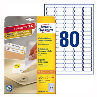 Avery Zweckform etikety 35,6mm x 16,9mm, A4, bílé, 80 etiket, snímatelné, baleno po 25 ks,