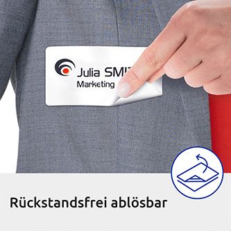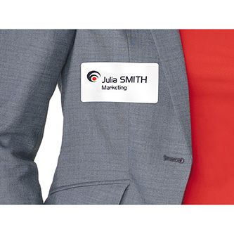 Samolepicí jmenovky 80 x 50 mmŽádné dohady, žádné otázky - jak jednoduché řešení. To získáte se samolepicími jmenovkami. Zlepšená flexibilita umožňuje pohyb spolu s látkou a zajišťuje bezpečné přilnutí bez ohýbání nebo upadnutí. Navíc technologie Peel-Away Design umožňuje snadné a rychlé sejmutí jmenovek - velká úspora času při velkých akcích.