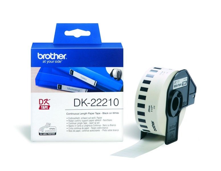 Originální páska Brother DK-22210 - černá na bílé, šířka 29 mmOdolná bílá papírová páska Brother DK-22210 využívá technologii přímého tepelného tisku, která vytváří štítky pro parcely, obálky nebo značení polic. Díky DK-22210 si můžete vychutnat možnost vytvářet libovolný typ štítku s vlastní délkou.