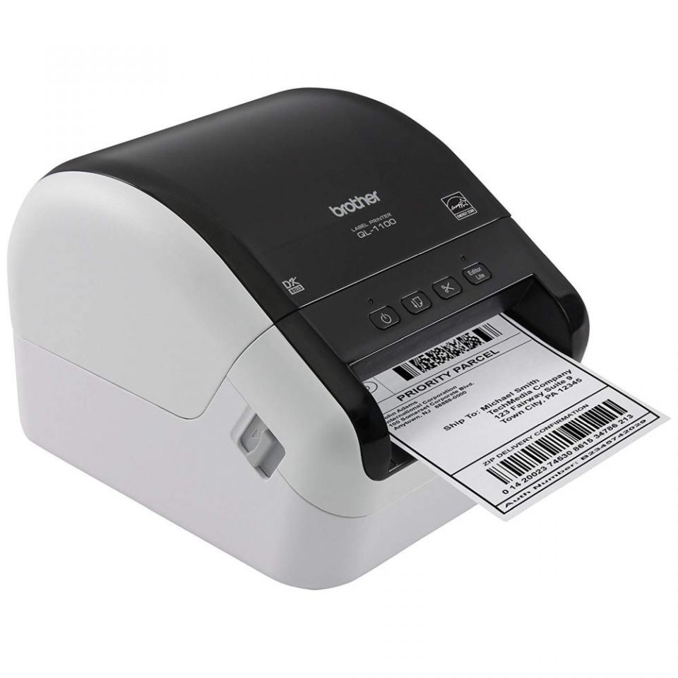 Tiskárna na papírové samolepící štítky nebo filmové role s automatickým odstřihem a šířkou tisku až 102 mm. Tento přístroj je možné použít pouze se spotřebním materiálem společnosti Brother (DK role / štítky).Šířka tisku 4” (101,6 mm)