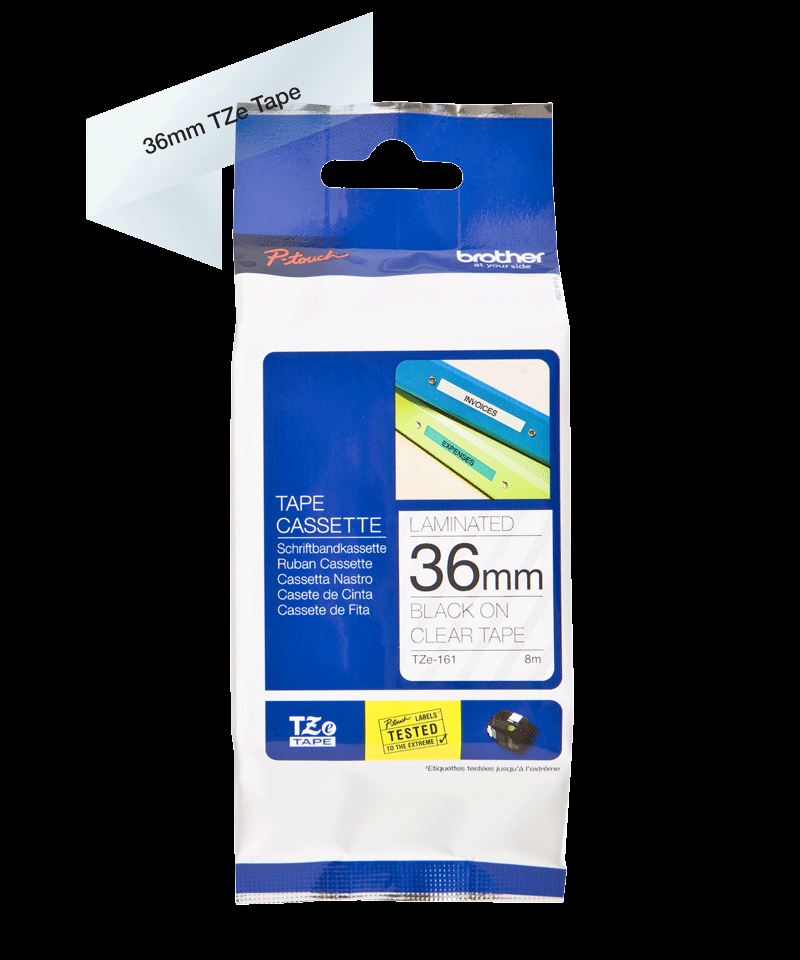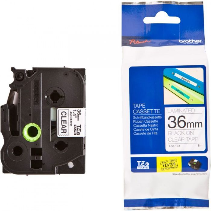 Originální kazeta s páskou Brother TZe-161 - černý tisk na průsvitné, šířka 36 mmOriginální kazeta s laminovanou páskou TZe-161 kompatibilní s širokou řadou tiskáren Brother P-touch je zvláště všestranná díky své snadno čitelné černé barvě na průsvitním podkladu - ideální pro domácnost, kancelář a další pracoviště.