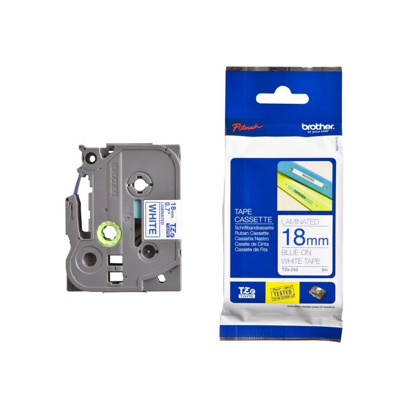 Originální kazeta s páskou Brother TZe-243 - modrý tisk na bílé, šířka 18 mmOriginální kazeta s laminovanou páskou TZe-243 kompatibilní s širokou řadou tiskáren Brother P-touch je zvláště všestranná díky své snadno čitelné modré a bílé barvě - ideální pro domácnost, kancelář a další pracoviště.