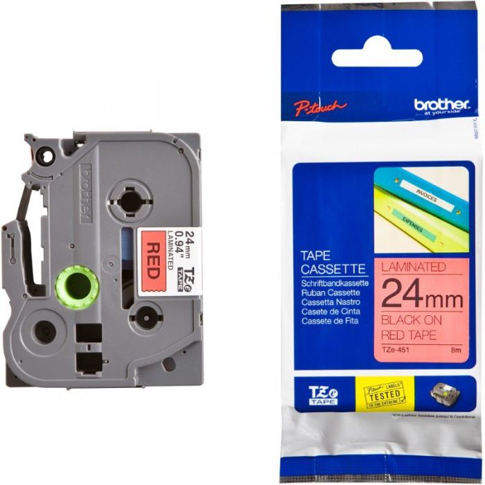 Originální kazeta s páskou Brother TZe-451 - černý tisk na červené, šířka 24 mmOriginální kazeta s laminovanou páskou TZe-451 kompatibilní s širokou řadou tiskáren Brother P-touch je zvláště všestranná díky své snadno čitelné černé a červené barvě - ideální pro domácnost, kancelář a další pracoviště.