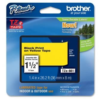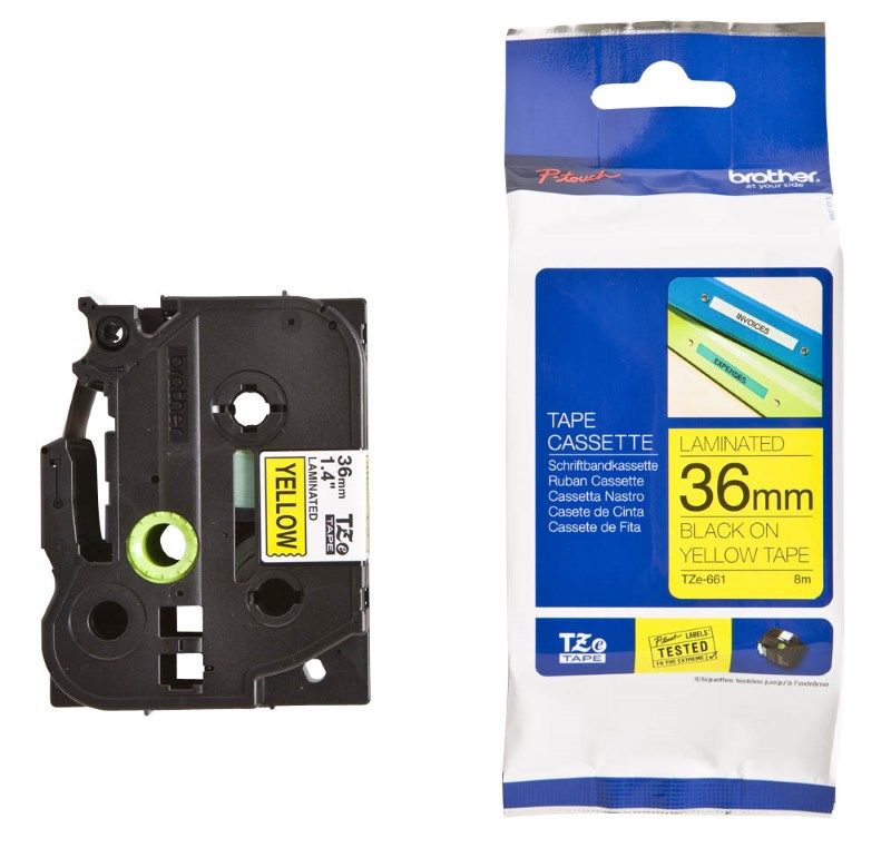 Originální kazeta s páskou Brother TZe-661 - černý tisk na žluté, šířka 36 mmOriginální kazeta s laminovanou páskou TZe-661 kompatibilní s širokou řadou tiskáren Brother P-touch je zvláště všestranná díky své snadno čitelné černé a žluté barvě - ideální pro domácnost, kancelář a další pracoviště.