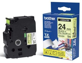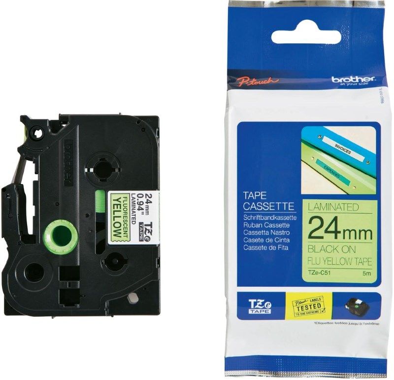 Originální kazeta s páskou Brother TZe-C51 - černý tisk na fluorescenční žluté, šířka 24 mmOriginální kazeta Brother TZe-C51 s černým tiskem na fluorescenčním žlutém podkladu je perfektní pro vytváření štítků, které zaujmou pozornost na důležité informace, jako je tvorba výstražných značek nebo kategorizace speciálních zařízení. Pomocí TZe-C51 můžete rychle zjistit důležité informace pro jakoukoliv mimořádnou situaci. Kompatibilní s tiskárnami štítků P-touch, které mají logo TZ nebo TZe na krytu kazety s páskou.