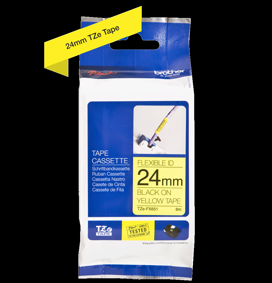 Originální flexibilní ID páska Brother TZe-FX651 - černý tisk na žluté, šířka 24 mmKazeta s 24 mm páskou Brother TZe-FX651 s černým tiskem na žlutém podkladu byla navržena pro použití k identifikaci drátových a optických kabelů. Speciální lepidlo podkladové vrstvy umožňuje vícenásobné obalení štítku kolem kabelu nebo přilepení k němu ve stylu praporku.