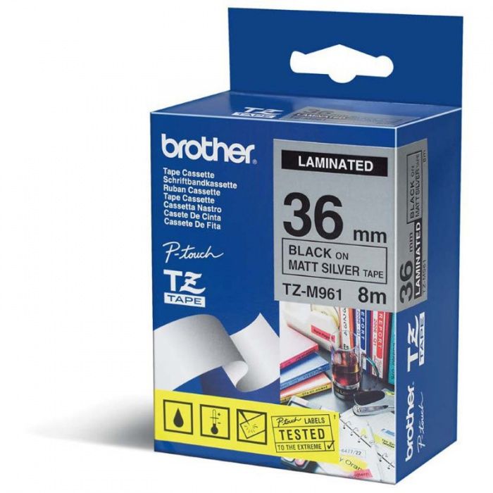 Originální kazeta s páskou Brother TZe-M961 - černý tisk na stříbrné matné, šířka 36 mmVšestranný černý a matně stříbrný design modelu TZe-M961 znamená, že je dokonalým nástrojem pro vytváření poutavého značení, které zobrazuje důležité informace o testech elektrické bezpečnosti a štítcích majetku. Tato odborně navržená laminovaná doplňovací páska je vhodná pro vnitřní i venkovní použití. Je kompatibilní s tiskárnami štítků P-touch, které mají logo TZ nebo TZe na krytu kazety s páskou.
