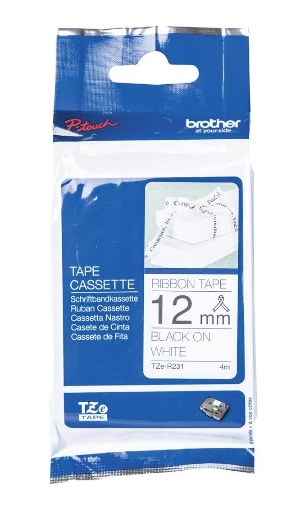 Originální kazeta s páskou Brother TZe-R231 - černý tisk na bílé, šířka 12 mmVyužijte svou kreativitu přidáním vlastního návrhu štítků na dárky, kartičky a řemeslnické výrobky s originální páskou Brother TZe-R231. S TZe-R231 se můžete spolehnout na rychlý, spolehlivý návrh štítků a profesionální standard tisku. Kompatibilní s tiskárnami štítků P-touch, které mají logo TZ nebo TZe na krytu kazety s páskou.