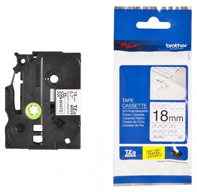 Originální kazeta s páskou Brother TZe-SE4 - černý tisk na bílé, šířka 18 mmChraňte se před krádeží a manipulací s originální páskou Brother TZe-SE4. Tato odborně vyvinutá bezpečnostní plombovací páska TZe-SE4 vám přinese jistotu, že okamžitě zjistíte manipulaci se zapečetěným zařízením.