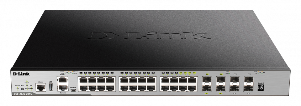 D-Link DGS-3630-28PC/SI je výkonný 28-portový L3 stohovatelný řízený Gigabit PoE switch s 10G uplinky. Je osazen 20 Gigabit porty RJ-45 s PoE 802.3at, 4 Gigabit Combo RJ-45/SFP porty a 4x 10G SFP+ porty pro uplink nebo HW stacking. Nabízí celkový PoE výkon 370W s možností rozšíření na 740W použitím externího zdroje DPS-700. Kromě L2 funkcí podporuje statický a RIP routing, pomocí licencí lze rozšířit o OSPF, BGP, PIM a MPLS. Switch je ideálním řešením jako agregační / páteřní switch pro podnikové sítě typu SMB / Enterprise, kamerové systémy a ISP poskytovatele internetu.- 20x 10/100/100/1000M RJ-45 PoE+ 802.3at