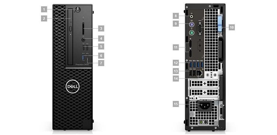 1. Vypínač | 2. Optická jednotka (volitelná) | 3. Interní čtečka paměťových karet SD (volitelná) | 4. Univerzální audiokonektor typu jack | 5. 2 porty USB 2.0 typu A | 6. USB 3.1 typu A [5 Gb] | 7. USB 3.1 typu C [10 Gb] | 8. Zvukový výstup | 9. Klávesnice/myš PS2 | 10. Sériový port | 11. DisplayPort (2) | 12. 4 porty USB 3.1 typu A [5 Gb] | 13. 2 porty USB 2.0 typu A (s technologií SmartPower) | 14. Síťový konektor RJ45 | 15. Napájecí konektor