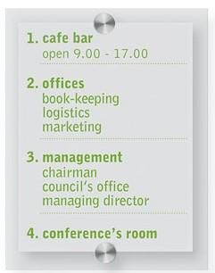 Informační dveřní tabulka určená pro vnitřní použití jako ideální řešení orientačního systému a označení. Skládá se ze dvou desek vyrobených z průhledného plexiskla. Na krátkých stranách desky jsou umístěny dekorativní šrouby z nerezové oceli proelegantní a moderní vzhled a bezpečné uložení informací. Existuje možnost zavěšení desky jak vertikálně, tak horizontálně. Snadné a rychlé sestavení. Při použití čiré fólie pro laserové tiskárny např. Folex BG 72 lze docílit zcela transparentního efektu.Vnjěší rozměr: 340 x 250 mmDotaz na produkt