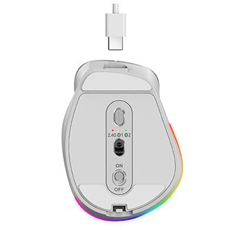 Ergonomická bezdrátová myš v kompaktním provedení disponuje optickým senzorem s nastavitelným rozlišením až 2400 DPI. Připojení k počítači je realizováno bezdrátově skrze Bluetooth nebo miniaturní USB přijímač a rozhraní 2,4 GHz. Myš se dokáže připojit až ke 3 zařízením zároveň, mezi nimi pak můžete přepínat stiskem jediného tlačítka (Dual BT režim + 2,4 GHz). USB přijímač lze pro snadné přenášení uschovat v těle myši. Napájení zajišťuje vestavěná dobíjecí baterie s kapacitou 500 mAh, kterou lze nabíjet pomocí USB-C portu. Potěší také stylové sedmibarevné podsvícení.