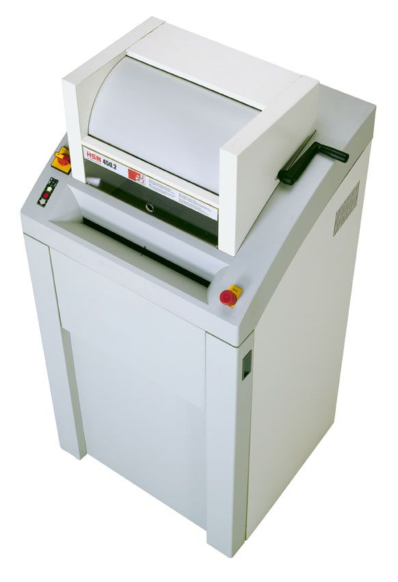 Výkonný skartovač pro technická poschodí kancelářských budov s kapacitou řezu až 101 kg/h. Oddělený vstup s turniketem umožňuje zpracování zmačkaných papírů. Masivní nože s jemným příčným řezem zajišťují vysoký stupeň utajení. Stroj vyniká širokým vstupem. Odpad padá do uzavřeného prostoru s vyvážecím vozíkem vybaveným závěsem na plastové pytle. HSM 450.2 je vhodný jako centrální skartovač pro administrativní centra, nemocnice a další organizace, kde je třeba zpracovávat velká množství papíru. Záruka 12 měsíců při jednosměnném provozu.Specifikace: