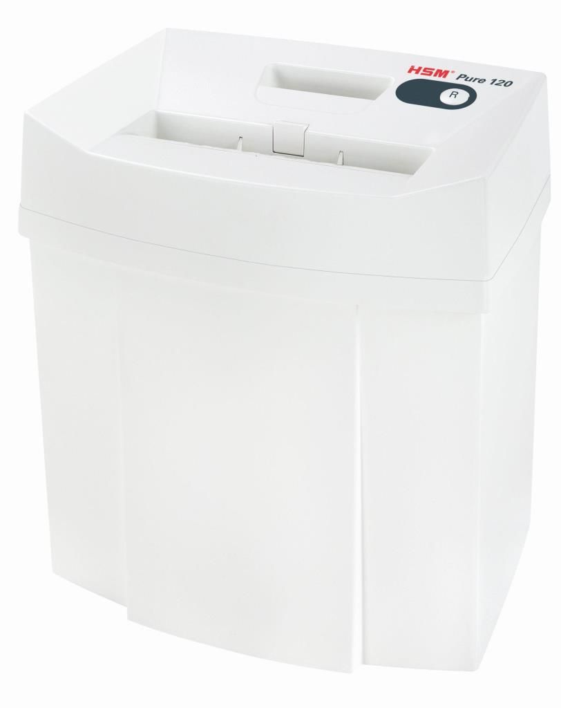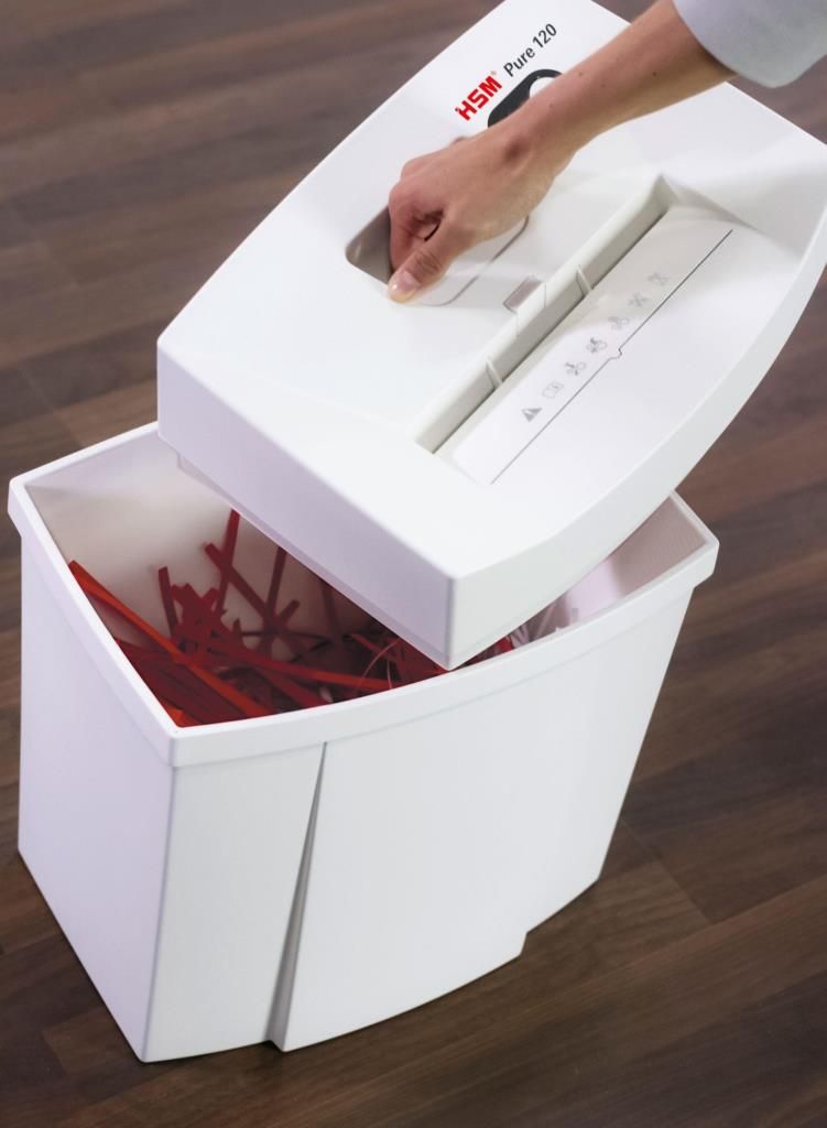 Nejmenší skartovací stroj z nové řady HSM Pure „ke stolu“. Konstrukce je dvoudílná, se snímatelnou hlavou a praktickým madlem. Ovládání je automatické, s výkyvným spínačem, který zajišťuje nulovou spotřebu elektrické energie ve STAND-BY režimu. Vstupní otvor je chráněn bezpečnostní klapkou, která v případě kontaktu vypíná chod skartovače. Při zahlcení nožů se automaticky zapíná zpětný chod. Stroj je rovněž vybaven tlačítkem pro manuální spuštění zpětného chodu. Uvedený skartovač vyniká tichým chodem, má praktický průhled do objemného zásobníku na skartovaný odpad pro možnost kontroly stavu naplnění. Odolné nože ze zakalené oceli umožňují skartování dokumentů s kovovými kancelářskými sponkami a plastových karet. Mají doživotní záruku proti výrobním vadám.Stupně utajení dle GDPR: P-4 / T-4 / E-3/F-1Specifikace: