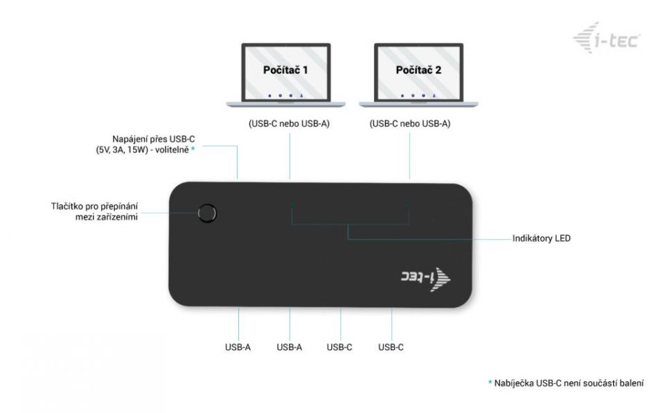 I-tec Universal KVM HUB 2x USB-C + 2x USB-A 3.0 Port- Malý, šikovný HUB, ke kterému můžete připojit dva notebooky či počítače, a připojená USB zařízení mezi nimi jednoduše a pohodlně sdílet