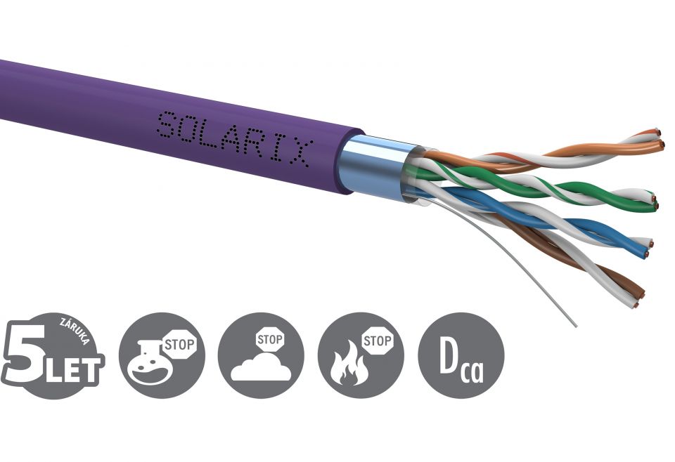 Instalační kabel Solarix s označením SXKD-5E-FTP-LSOH je spolehlivý stíněný kabel kategorie 5E, který je určený pro provoz ethernetových protokolů, včetně 2.5GBASE-T a 5GBASE-T*. Konstrukce kabelu je F/UTP, typ pláště LSOH s třídou reakce na oheň Dca-s1,d2,a1. Vodiče kabelu jsou vyrobeny z kvalitního měděného drátu s čistotou mědi 99,97 %. Kabel bez problémů splňuje požadavky z mezinárodních standardů ISO/IEC 11801, EN 50173 a ANSI/TIA 568.2-D. Výkonové parametry tohoto kabelu byly otestovány nezávislou testovací zkušebnou FORCE TECHNOLOGY v rámci programu EC Verified, a to na nejvyšší úroveň tzv. Component Level. Certifikát je k dispozici zde na webu v záložce "Odkazy" nebo přímo na stránkách laboratoře FORCE. V případě CPR (nařízení EU č. 305/2011) je kabel testován u nezávislé laboratoře FORCE TECHNOLOGY v systému posuzování vlastností AVCP 3. Stejně jako ostatní kabely Solarix, je i kabel SXKD-5E-FTP-LSOH značen metráží po 1 m v rozsahu od 0 do 500 m. Kabel je dodáván na vysoce pevné dřevěné cívce, na které jsou uvedeny všechny nezbytné produktové informace, včetně čárových kódů, výrobní šarže, popisu a nejdůležitějších technických parametrů.Technické parametry