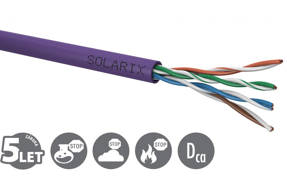 Instalační kabel Solarix s označením SXKD-5E-UTP-LSOH je spolehlivý nestíněný kabel kategorie 5E, který je testován až do šířky pásma 350 MHz, a je určený pro provoz ethernetových protokolů, včetně 2.5GBASE-T a 5GBASE-T*. Konstrukce kabelu je U/UTP, typ pláště LSOH s třídou reakce na oheň Dca-s1,d2,a1. Vodiče kabelu jsou vyrobeny z kvalitního měděného drátu s čistotou mědi 99,97%. Kabel bez problémů splňuje požadavky z mezinárodních standardů ISO/IEC 11801, EN 50173 a ANSI/TIA 568.2-D. Výkonové parametry tohoto kabelu byly otestovány nezávislou testovací zkušebnou FORCE TECHNOLOGY v rámci programu EC Verified, a to na nejvyšší úroveň tzv. Component Level. Certifikát je k dispozici zde na webu v záložce "Odkazy" nebo přímo na stránkách laboratoře FORCE. V případě CPR (nařízení EU č. 305/2011) je kabel testován v systému posuzování vlastností AVCP 3. Stejně jako ostatní kabely Solarix, je i kabel SXKD-5E-UTP-LSOH značen metráží po 1 m v rozsahu od 0 do 100 m. Kabel je dodáván ve vysoce odolném třívrstvém leštěném kartónovém boxu (vždy barevně odlišeném podle typu kabelu), na kterém jsou uvedeny všechny nezbytné produktové informace, včetně čárových kódů, výrobní šarže, popisu a nejdůležitějších technických parametrů.Technické parametry