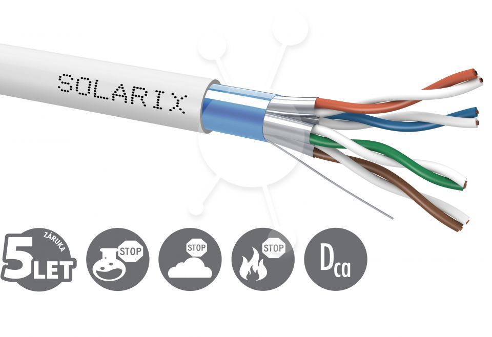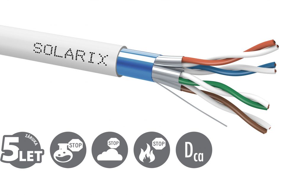 Instalační kabel Solarix s označením SXKD-6A-FFTP-LSOH je vysoce kvalitní dvakrát stíněný kabel kategorie 6A, který je určený pro provoz vysokorychlostních ethernetových protokolů, včetně 10GBASE-T. Konstrukce kabelu je F/FTP, typ pláště LSOH s třídou reakce na oheň Dca-s2,d2,a1. Vodiče kabelu jsou vyrobeny z kvalitního měděného drátu s čistotou mědi 99,97 %. Kabel bez problémů splňuje požadavky z mezinárodních standardů ISO/IEC 11801, EN 50173 a ANSI/TIA 568.2-D. V případě CPR (nařízení EU č. 305/2011) je kabel testován u nezávislé laboratoře FORCE TECHNOLOGY v systému posuzování vlastností AVCP 3. Stejně jako ostatní kabely Solarix, je i kabel SXKD-6A-FFTP-LSOH značen metráží po 1 m v rozsahu od 0 do 500 m. Kabel je dodáván na vysoce pevné dřevěné cívce, na které jsou uvedeny všechny nezbytné produktové informace, včetně čárových kódů, výrobní šarže, popisu a nejdůležitějších technických parametrů.Technické parametry