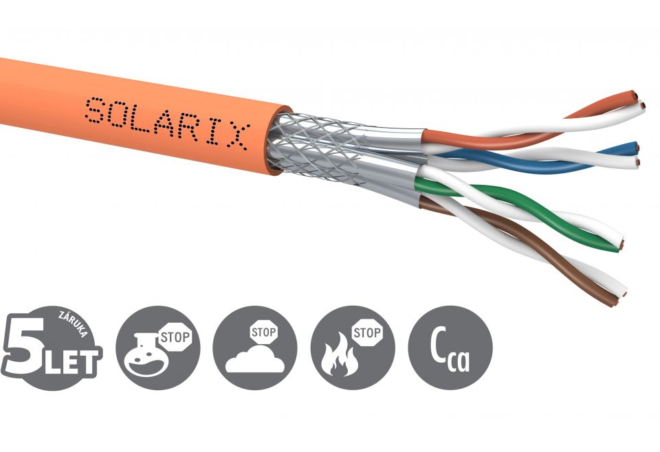 Instalační kabel Solarix s označením SXKD-7-SSTP-LSOH je vysoce kvalitní dvakrát stíněný kabel kategorie 7, který je testovaný až do šířky pásma 1 000 MHz a je určený pro provoz vysokorychlostních ethernetových protokolů, včetně 10GBASE-T. Konstrukce kabelu je S/FTP, typ pláště LSOH s třídou reakce na oheň Cca-s1,d1,a1. Vodiče kabelu jsou vyrobeny z kvalitního měděného drátu s čistotou mědi 99,97 %. Kabel bez problémů splňuje požadavky z mezinárodních standardů ISO/IEC 11801 a EN 50173. Výkonové parametry tohoto kabelu byly otestovány nezávislou testovací zkušebnou FORCE TECHNOLOGY v rámci programu EC Verified, a to na nejvyšší úroveň tzv. Component Level. Certifikát je k dispozici zde na webu v záložce "Odkazy" nebo přímo na stránkách laboratoře FORCE. V případě CPR (nařízení EU č. 305/2011) je kabel testován v systému posuzování vlastností AVCP 1+. Stejně jako ostatní kabely Solarix, je i kabel SXKD-7-SSTP-LSOH značen metráží po 1 m v rozsahu od 0 do 500 m. Kabel je dodáván na vysoce pevné dřevěné cívce, na které jsou uvedeny všechny nezbytné produktové informace, včetně čárových kódů, výrobní šarže, popisu a nejdůležitějších technických parametrů.Technické parametry