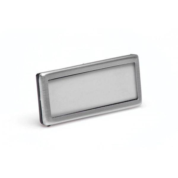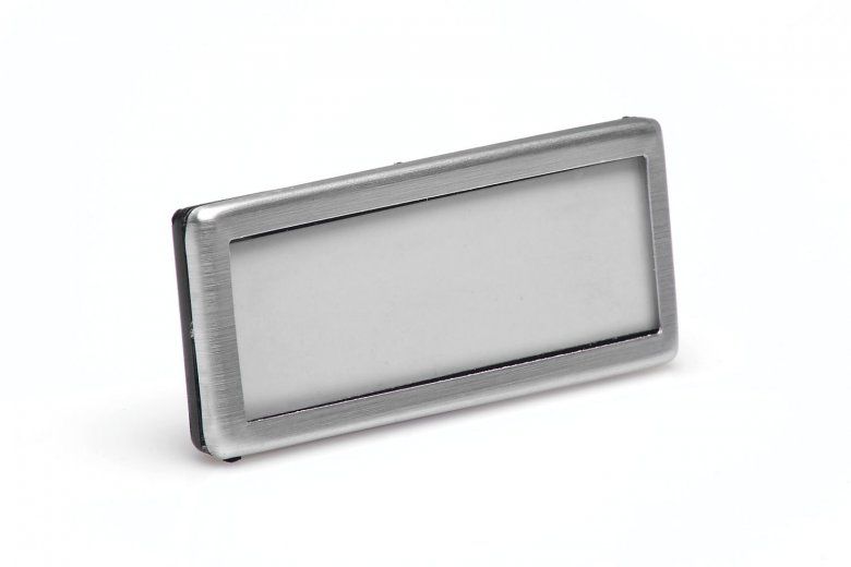 Luxusní jmenovka s okénkem, kombinace hliník / černý plast, provedení z hliníku s matovou povrchovou úpravou. Část jmenovky určená k popisu je chráněna čirým tuhým plastem, potaženým snímatelnou fólií - tato část má rozměr 62×18 mm. Vnější rozměr celé visačky je 65x26 mm. Možnost uchycení na oděv pomocí špendlíku nebo speciálních plastových úchytek, které žádným způsobem nepoškodí oděv.Specifikace: