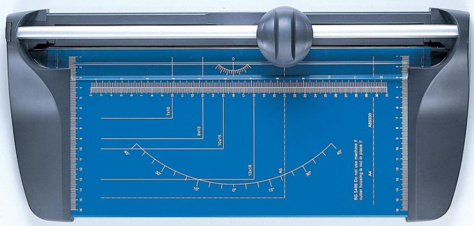 Kotoučová řezačka s broušeným kolečkem na profilované tyči s maximální délkou řezu 330 mm. Pracovní stůl je vybaven natištěnými měřítky a úhly. Nechybí přítlačná lišta z průhledného plastu. Řezačka díky své konstrukci uřízne bez problémů 10 listů papíru 70g/m2.Specifikace: