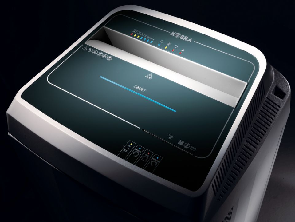 Profesionální skartovačka s dotykovým displejem, kde se všechny ovládací prvky aktivují pouhým dotykem panelu. Tepelná ochrana výkonného 2600 W motoru umožňuje 24 hodin nepřetržitého provozu bez přehřátí. Skartovač Kobra 410 TS S5 dokáže najednou skartovat až 72 listů v křížovém řezu 5,8 mm (P-2). Dokáže skartovat i průhlednou fólii. Vysoce odolný řetězový pohon s ocelovými převody a řezacími noži z tvrzené uhlíkové oceli, které nabízejí spolehlivost a odolnost proti opotřebení.Stroj je vybaven integrovaným automatickým mazacím systémem, EPC (elektronická regulace výkonu) pro optimalizaci skartování bez zaseknutí, systémem Energy Smart a automatickým odpojením od elektrické sítě pro maximální úsporu energie, automatickým Start&Stopem, bezpečnostním zastavením při otevření dveří a/nebo plném vaku s odpadem a automatický zpětný chod v případě zaseknutí. Robustní a velká kovová odpadní nádoba o objemu 205 litrů je umístěná na kolečkách.Možnost volitelného vybavení: oddělená řezací jednotka pro CD/DVD/kreditní karty (oddělení skartovaných materiálů do dvou odpadních nádob) a systém detekce kovů.Specifikace: