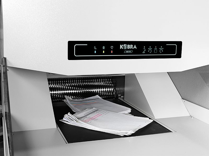 Vysoce výkonný pásový průmyslový skartovač navržen pro vysoký výkon skartace a nepřetržitý provoz. Stroj je vybaven pohodlným pásovým dopravníkem pro snadné podávání materiálu ke skartaci. Najednou lze skartovat až 130 listů papíru. Kobra 430 TS skartuje také CD, DVD, kreditní karty, diskety v křížovém řezu 5,8 mm x 50 mm (P-3). Je vybaven super silnou pohonnou jednotkou sestávající se z systému těžkého řetězového pohonu s ocelovými převody. Řezné nože z uhlíkové kalené oceli si hravě poradí i se sešívacími a kancelářskými sponkami. Tepelná ochrana motoru umožňuje nepřetržitý provoz 24 hodin bez nutnosti pracovního cyklu či chlazení. Kobra 430 TS je dodávána s integrovaným automatickým systémem mazání, který zajišťuje maximální účinnost. Automatické zastavení se světelným signálem pro plnou nádobu na odpad nebo otevřená dvířka skříně. Odnímatelná a robustní nádoba na odpad o objemu 470 litrů je umístěná na kolečkách. Nádobu lze uspořádat dvěma způsoby, a to buďto dvěma plastovými vaky na odpad o objemu 235 litrů nebo jedním o objemu 470 litrů.Specifikace: