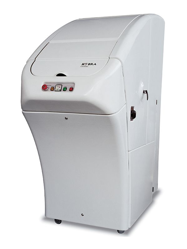 Kobra Cyclone je vrcholem vývoje technologie skartování. Nože rotující velmi vysokou rychlostí v kombinaci s výkonem turbíny, která zajišťuje proudění vzduchu, umožňují skartovat až 500 listů papíru najednou a také skartovat mnoho dalších druhů materiálů na 5 různých dostupných velikostí řezu. Velikost řezu (úroveň zabezpečení) se volí při objednávce stroje, nicméně i po instalaci jednotky bude vždy možné kdykoli jednoduchým úkonem změnit úroveň zabezpečení a přizpůsobit stroj tak jakékoli potřebě skartování. Nejnižší úroveň zabezpečení nastavuje stroj na minimální objemovou redukci skartovaného materiálu a maximální výkon skartování za hodinu a nejvyšší úroveň zabezpečení nastavuje stroj na vysokou bezpečnost skartování a maximální objemovou redukci. Kobra Cyclone je také vybavena integrovaným vysávacím systémem speciálně navrženým tak, aby obsluze poskytoval čisté a bezprašné prostředí pro skartování. Cyclone je konstruován s dvojitou izolací skartovací komory a speciálním plastovým krytem vnějšího komory pro nízkou hlučnost provozu. Kobra Cyclone může dosáhnout působivého skartovacího výkonu 420 kg papíru za hodinu (teoretický výkon), aniž by stroj vyžadoval mazání řezných nožů nebo speciální údržbu a pojme na jeden skartovácí cyklus 500 listů papíru 70 gr nebo 350 listů papíru A4 80 gr.Speciální příslušenství Kobra Compactor C-500 snižuje 4-5krát objem skartovaného papíru.Spotřební materiály:- Plastové pytle na odpad o objemu 400 litrů- Filtr vakuového systému- Rukávová spojka cyklonového kompaktoruSpecifikace: