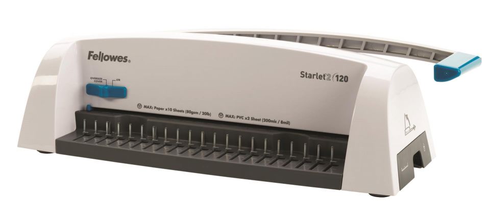 Základní model nové designové řady vázacích strojů Fellowes pro příležitostnou vazbu. Děrovací kapacita až 12 listů 80 g papíru. Kapacita vazby až 120 listů (do průměru hřbetu 16 mm). Vazač má dvě přednastavené pozice – pro děrování formátu A4 a A5.Oddělená děrovací a vázací páka pro průběžné vkládaní děrovaných listů do plastového hřbetu výrazně zefektivňuje práci. Díky delší děrovací páce je třeba k děrování minimum síly. Stroj je vybaven integrovanou měrkou pro správnou volbu průměru hřbetu.