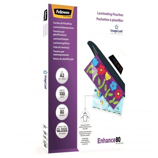 Enhance80. Zkrášlí a zvýrazní barevnost a celkový vzhled vašich dokumentů. Poskytnou jim ochranu proti nečistotám, vlhkosti a prodlouží jejich životnost. Prvotřídní laminovací fólie lesklé Fellowes ImageLast s šipkou směru laminace a logem, které po průjezdu nahřátým laminátorem vymizí. Vymizení znaků vás ujistí o optimální kvalitě laminace. Správná teplota laminátoru aktivuje lepivou složku fólie. Fólie je vyrobena s přesahem cca 3 mm na všech stranách oproti standadním formátům papíru. Vhodné pro laminaci za tepla pro všechny druhy stolních laminátorů. Doporučení nastavení teploty pro optimální laminaci: 80mic (90-110°C)