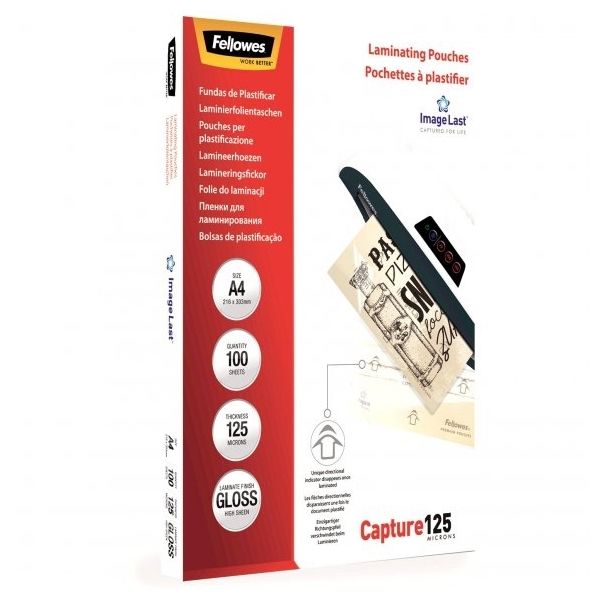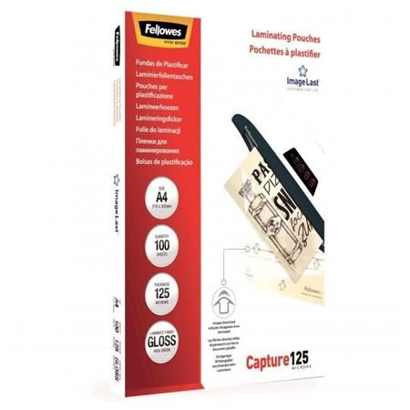 Capture125. Zachytí a zvýrazní barevnost a celkový vzhled vašich dokumentů. Zajistí mechanickou ochranu při časté manipulaci a ochrání proti nečistotám a vlhkosti. Prvotřídní laminovací fólie lesklé Fellowes ImageLast s šipkou směru laminace a logem, které po průjezdu nahřátým laminátorem vymizí. Vymizení znaků vás ujistí o optimální kvalitě laminace. Správná teplota laminátoru aktivuje lepivou složku fólie. Fólie je vyrobena s přesahem cca 3 mm na všech stranách oproti standadním formátům papíru. Vhodné pro laminaci za tepla pro všechny druhy stolních laminátorů. Doporučení nastavení teploty pro optimální laminaci: 125mic (110-120°C)