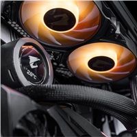 Obrovská porce výkonu si žádá i perfektních chlazení, to je zajištěno díky AIO kapalinovému chladiči Gigabyte Aorus Waterforce X 240. Součástí vodního bloku je kulatý, přizpůsobitelný 60 x 60 mm plně barevný LCD displej.