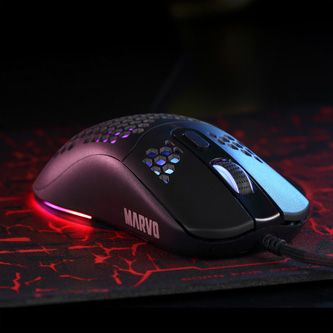 Herní myš Marvo G925Optická herní myš Marvo G925 je ultralehká, díky speciálnímu perforovanému designu, který připomíná včelí plástve (Honeycomb design). Díky tomu váží pouhých 70 g a je proto snáz ovladatelná při hře. Při dlouhodobé práci a hrách, proto nebudete pociťovat únavu. Oku bude lahodit RGB podsvícení myši.