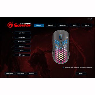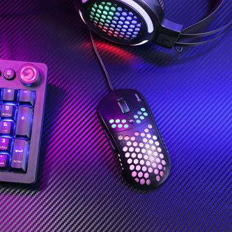 Herní myš M399Velkou výhodou této herní myši je její hmotnost. Díky perforovaného designu připomínající včelí plástve (Honeycomb design), který dodává myši také jedinečnost, je váha pouhých 76 g. Proto s ní lze během hraní snadněji manipulovat. Při dlouhodobé práci a hrách nebudete pociťovat únavu. Ergonomický tvar zajišťuje podporu dlaně, což je její velkou výhodou. Oku bude lahodit RGB podsvícení.