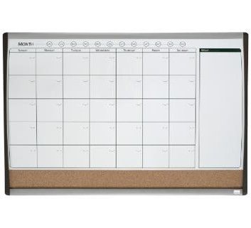 Kombinovaná tabule s měsíčním kalendářem je tvořena magnetickou tabulí s kalendářovou tabulkou stíratelnou za sucha a částí s korkovou nástěnkou. Obě části jsou zasazeny do výrazného černého a stříbrného rámu s kulatými rohy. Obsahuje pěnovou lepicí pásku, jeden magnetický černý popisovač ReWritable s mazací houbou a dva magnety. Rozměry 585 × 430 mm.Elegantní a stylová – Kombinovaná magnetická organizační tabule Nobo, 585 × 430 mm