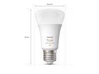 Pohodlné světlo v širokém spektru barevJas těchto žárovek je srovnatelná s tradičními žárovkami s výkonem 60 W. Jejich bílým a barevným světlem si můžete posvítit například při čtení na gauči, poslechu hudby či relaxaci v pokoji.Ovládejte aplikací Bluetooth až 10 světelAplikace Hue Bluetooth vám umožňuje ovládat chytré osvětlení Hue v jedné místnosti u vás doma. Můžete přidat až deset chytrých světel a ovládat je jednoduchým stisknutím tlačítka na vašem mobilním zařízení.Ovládejte světla hlasemPhilips Hue funguje s hlasovými asistenty Amazon Alexa či Google Assistant po spárování se zařízeními Google Nest nebo Amazon Echo. Pomocí jednoduchých hlasových příkazů můžete ovládat několik světel, ale i třeba jediné svítidlo v mísnosti.Vytvořte si zážitky šité na míru s barevným chytrým světlemProměňte svůj domov s více než 16 miliony barev a ihned vytvořte správnou atmosféru pro každou událost. Jediným stisknutím tlačítka můžete nastavit slavnostní náladu na večírek, proměnit váš obývací pokoj v kino, vylepšit váš domov s barevnými akcenty a mnohem více.Navoďte si správnou atmosféru teplým až studeným bílým světlemTyto žárovky a svítidla vám nabízí bílé světlo v širokém spektru odstínů, od teplé až po studenou. Protože jsou úplně stmívatelné (od jasného světla až po slabé noční osvětlení), můžete světla vyladit na odstín a jas, který bude ideálně vyhovovat vašim každodenním potřebám.Získejte ideální světelná schémata pro vaše každodenní činnostiUsnadněte si a zpříjemněte den předvolenými světelnými schématy speciálně vytvořenými pro vaše každodenní činnosti: Povzbuzující, Soustředění, Čtení a Relaxační. Dvě scény ve studených tónech, Povzbuzující a Soustředění, vám pomohou zahájit den a soustředit se, scény s teplejším světlem, Čtení a Relaxační, pak využijete, když si budete chtít pohodlně číst nebo nechat svou mysl odpočinout.Technické specifikaceRozměry (Š×V×H): 60x110Ochrana životního prostředíProvozní vlhkost: 5% Provozní teplota: -20 až 45 °CObsahuje funkce/příslušenství navícMožnost ztlumení pomocí vypínače Hue Switch a aplikace Hue: AnoZáruka2 roky: AnoSpotřeba elektrické energieTřída energetické účinnosti (EEL): FServisZáruka: 2 rokyTechnické údajeHmotnost: 72Technologie žárovky: LEDSvětelný tok při 2700 K (výchozí nastavení z výroby): 570 lmSvětelný tok při 4000 K: 830 lmŽárovkaTeplota chromatičnosti: 2000K-6500K +16 million colorsPrůměr: 62 mmEnergetický štítek (ACC (EU) 874/2012; A++ – E): FPatice: E27Tvar produktu: A60Výška: 110 mmVstupní napětí: 220V-240VŽivotnost: 25 000 hSvětelný výkon: 16 milionů barevSvětelný tok: 800 lmMax. provozní výkon: 6,5 WMax. výkon v pohotovostním režimu: 0.5 WPočet cyklů zapnutí: 50 000Účiník: 0.5Jmenovitá životnost: 25 000 hUpgradovatelný software: při připojení k aplikaci Bluetooth App nebo Hue BridgeSpuštění: Okamžitý 100% světelný výkonPříkon: 6,5 WKomunikační protokolBluetooth a ZigbeeUpgradovatelný softwarePři připojení k aplikaci Bluetooth nebo zařízení Hue BridgeObsah baleníŽárovky systému Hue: 4Podporované systémykompatibilní s technologií HomeKitYesIOSYesAplikace Philips HueiOS 13 a novější Android 8.0 a novějšíHlasoví asistentiAmazon Alexa Google Assistant Apple HomeKit (přes Hue Bridge) Microsoft Cortana (přes Hue Bridge)Rozměry a hmotnost baleníEAN/UPC – výrobek: 8719514328402Čistá hmotnost: 0,283 kgHrubá hmotnost: 0,391 kgVýška: 174,000 mmDélka: 140,000 mmŠířka: 146,000 mmČíslo materiálu (12NC): 929002489604Dotaz na produkt