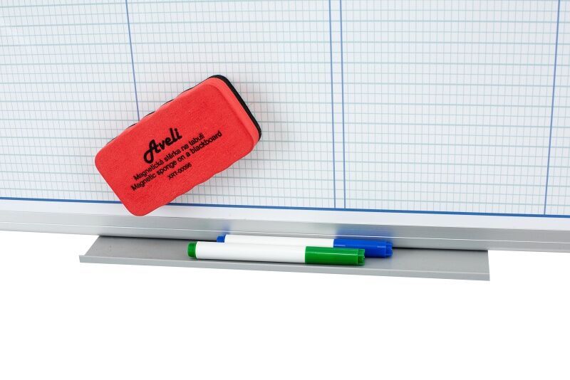 Magnetická plánovací tabule AVELI má elegantní rám z kvalitního eloxovaného hliníku, jehož součástí je praktická odkládací lišta na popisovače. Na tabuli je možné psát stíratelným fixem. Tabule má světle šedé plastové rohy, které zakryjí upevnění na zeď