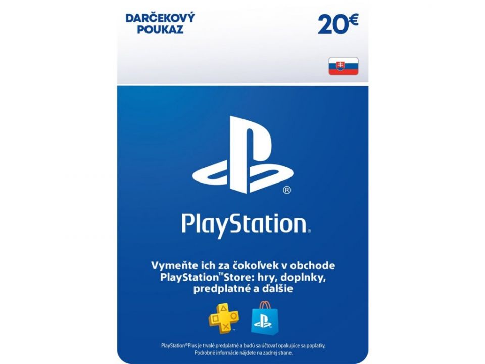 PLAYSTATION STORE – DÁRKOVA KARTA 20 EURPřidej si snadno prostředky na svůj účet v síti PlayStation Network i bez kreditní karty. Lze uplatnit na veškeré produkty v největší knihovně obsahu pro PlayStation na světě jejíž součástí jsou - hry, virtuální měna, doplňky, předplatné a mnoho dalšího. Elektronická licence. Hodnota karty 20 EUR.
