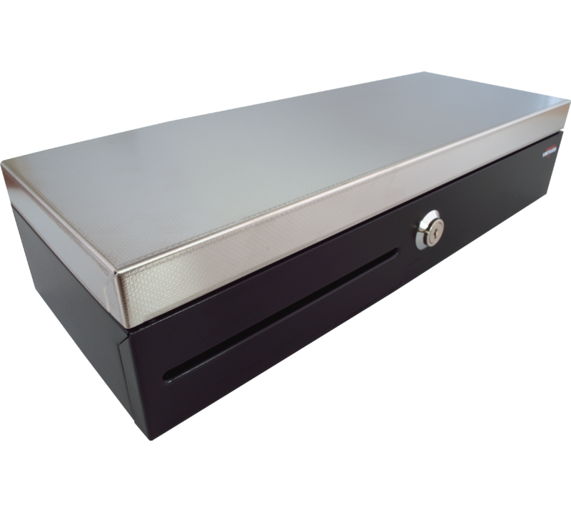 Pokladní zásuvka flip-top FT-460V2 - bez kabelu, se zam. krytem, NEREZ víko, černáNEREZ víko s perforací, zamykatelný kryt pořadače, konektor RJ50, s kabelem RJ12 24V, 9-24V