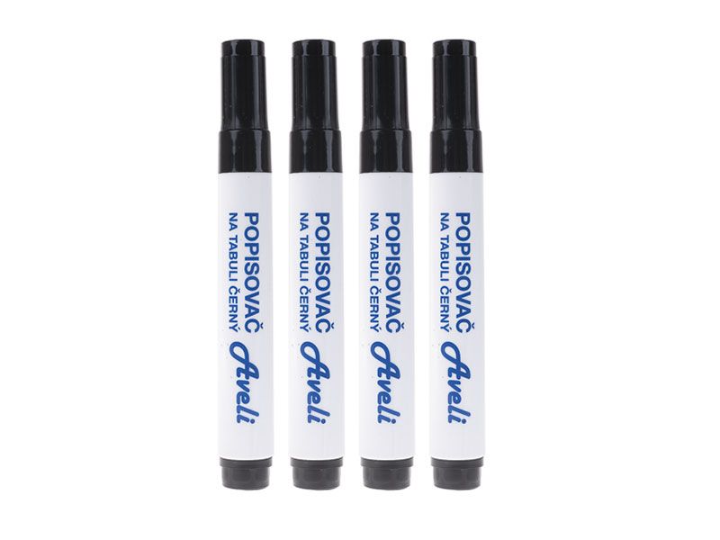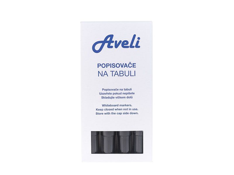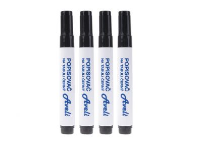 "Popisovač pro tabule a flipcharty AVELI. Sada 4 barevných popisovačů nebo jednotlivě černý popisovač.V balení 4 ks."